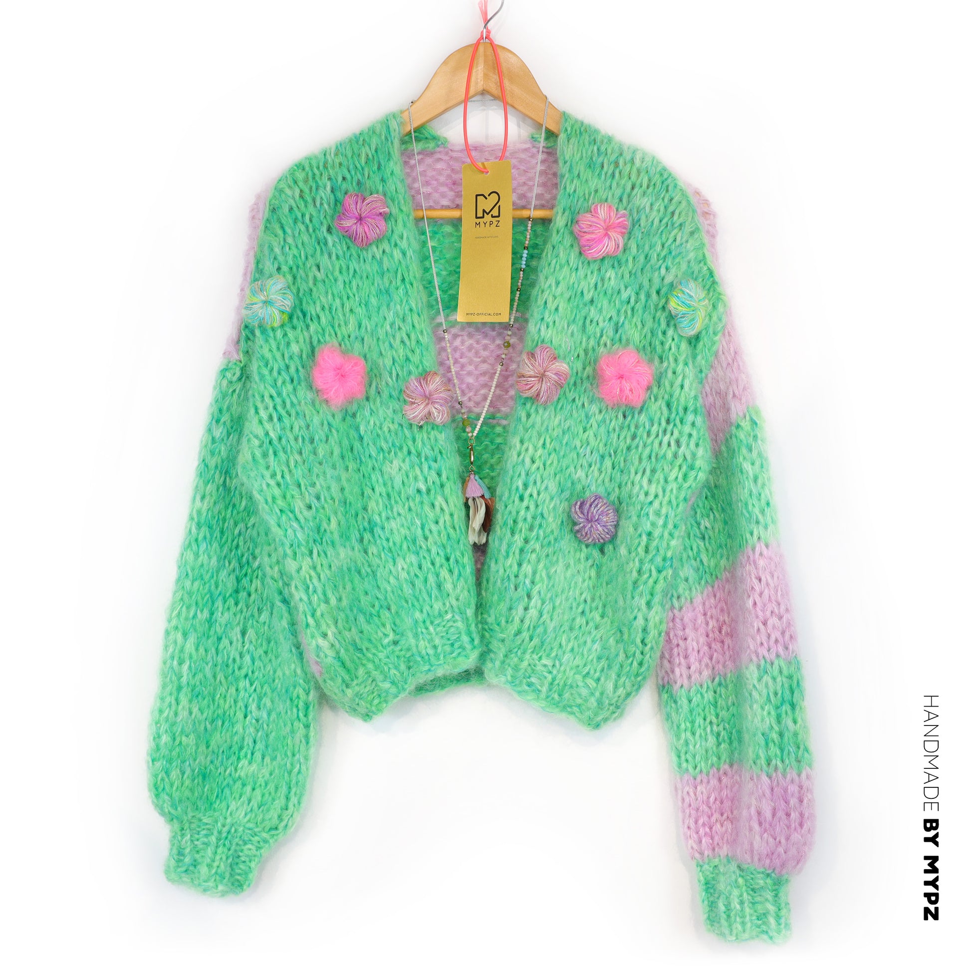 This is a handmade knit made by MYPZ in The Netherlands. Each cardigan or sweater is a unique piece and we take a lot of time and care to create these beautiful products. This beautiful sweater is made of a high quality mohair and does not pill. It is very light, warm and comfortable. These brushed yarns may shed a little but after a while, this will subside.