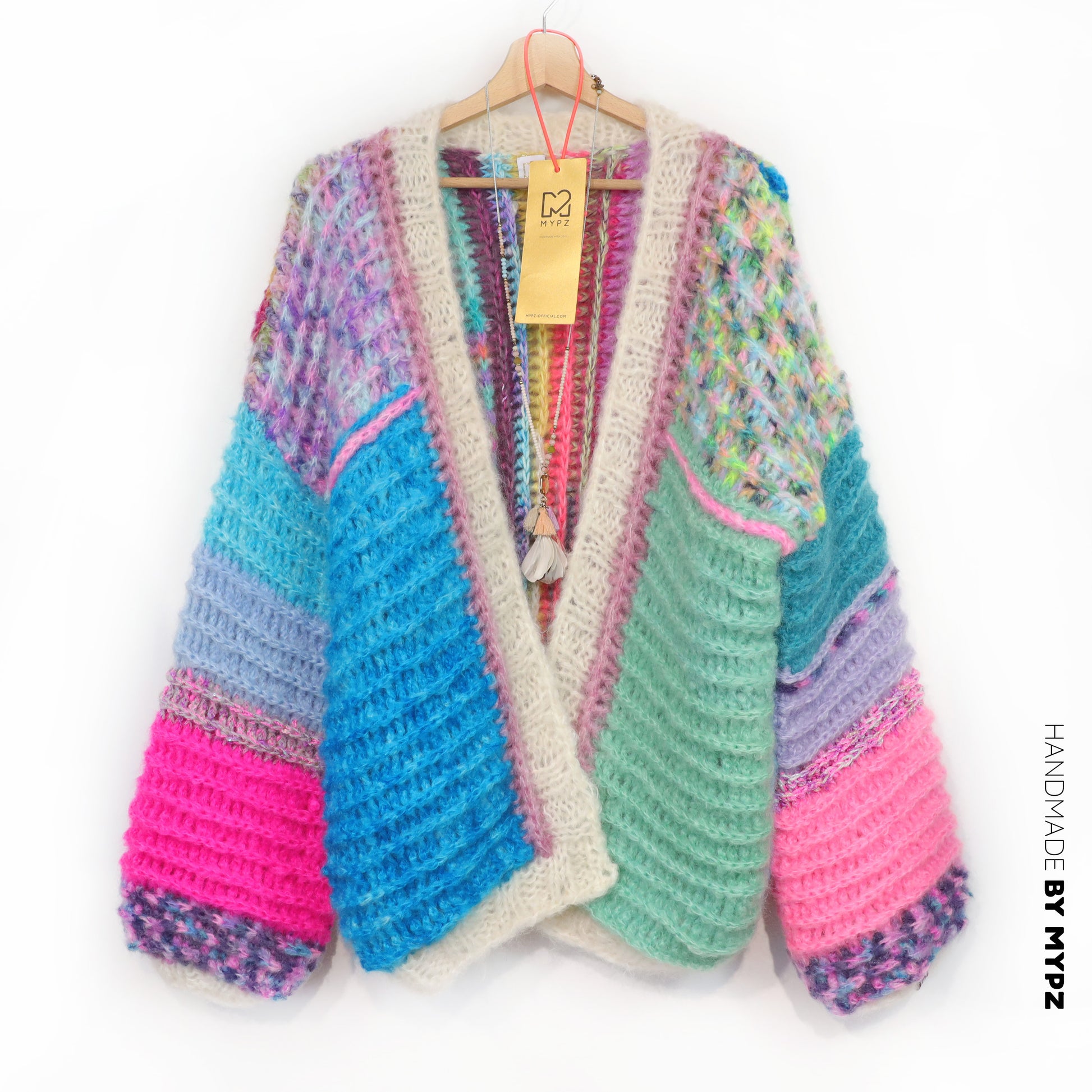 This is a handmade knit made by MYPZ in The Netherlands. Each cardigan or sweater is a unique piece and we take a lot of time and care to create these beautiful products. This beautiful sweater is made of a high quality mohair and does not pill. It is very light, warm and comfortable. These brushed yarns may shed a little but after a while, this will subside.